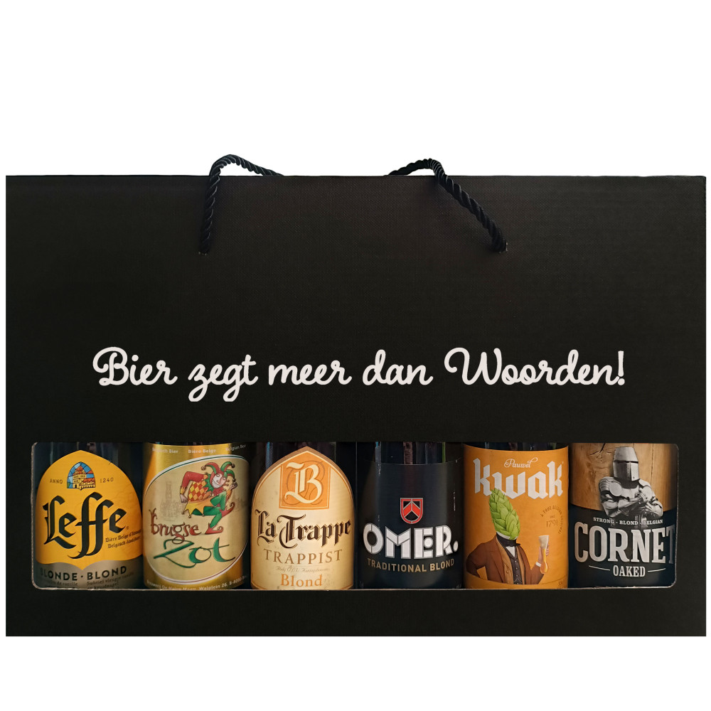 Tags: Bierpakket, Geschenken, Kado, Cadeau, LEFFE abdijbier blond, BRUGSE ZOT bier blond, LA TRAPPE trappist blond, OMER bier blond, KWAK blond, CORNET Oaked blond